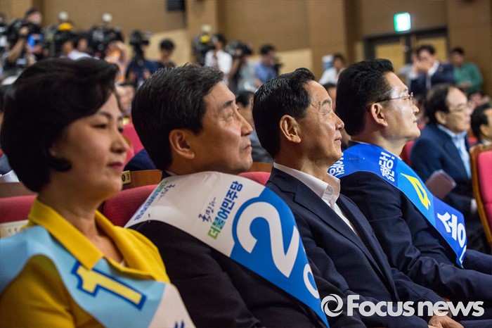 (서울=포커스뉴스) 더불어민주당 전당대회 당대표에 출마한 후보들이 5일 오후 서울 여의도 국회의원회관에서 열린 '전당대회 당대표 예비경선(컷오프)'에 참석해 정견발표를 기다리고 있다. 왼쪽부터 추미애 후보, 이종걸 후보, 김상곤 후보, 송영길 후보.