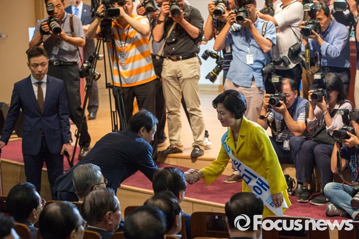 (서울=포커스뉴스) 우상호(왼쪽) 더불어민주당 원내대표와 전당대회 당 대표에 출마한 추미애 의원이 5일 오후 서울 여의도 국회의원회관에서 열린 '전당대회 당대표 예비경선(컷오프)'에 참석해 정견발표에 앞서 악수 하고 있다.