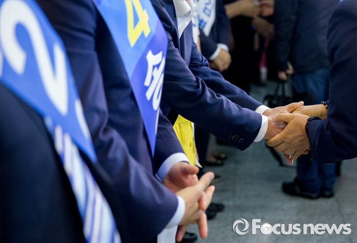 (서울=포커스뉴스) 5일 오후 서울 여의도 국회 의원회관에서 열린 더불어민주당 당대표 선출을 위한 예비경선대회에 참석한 당대표 후보들이 참석자들에게 지지를 호소하고 있다.