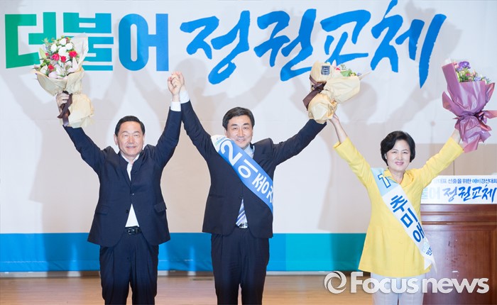 (서울=포커스뉴스) 5일 오후 서울 여의도 국회 의원회관에서 열린 더불어민주당 당대표 선출을 위한 예비경선대회에서 후보로 확정된 김상곤(왼쪽부터), 이종걸, 추미애 당대표 후보가 취재진을 향해 포즈를 취하고 있다. 이날 경선에서는 송영길 당대표 후보가 탈락했다.