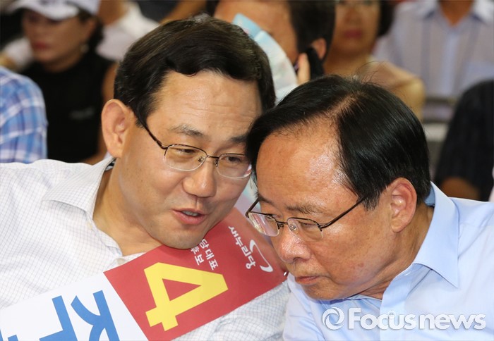 (천안=포커스뉴스) 5일 오후 충남 천안시 유관순체육관에서 열린 새누리당 대표 및 최고위원 선출 충청권 합동연설회에서 주호영 후보와 이주영 후보가 대화하고 있다.