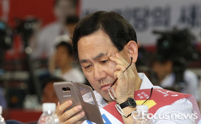 (천안=포커스뉴스) 5일 오후 충남 천안시 유관순체육관에서 열린 새누리당 대표 및 최고위원 선출 충청권 합동연설회에서 주호영 후보가 핸드폰을 보며 굳은 표정을 보이고 있다.