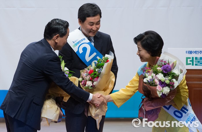 (서울=포커스뉴스) 5일 오후 서울 여의도 국회 의원회관에서 더불어민주당 당대표 선출을 위한 예비경선대회를 마친 김상곤(왼쪽부터), 이종걸, 추미애 당대표 후보가 인사하고 있다.
