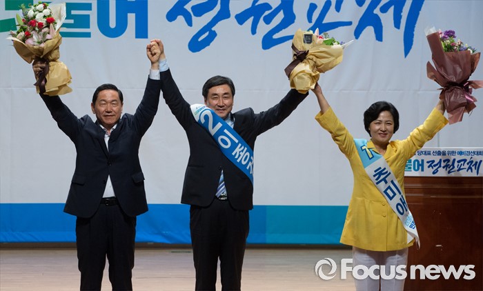(서울=포커스뉴스) 5일 오후 서울 여의도 국회 의원회관에서 더불어민주당 당대표 선출을 위한 예비경선대회를 마친 김상곤(왼쪽부터), 이종걸, 추미애 당대표 후보가 취재진을 향해 포즈를 취하고 있다.
