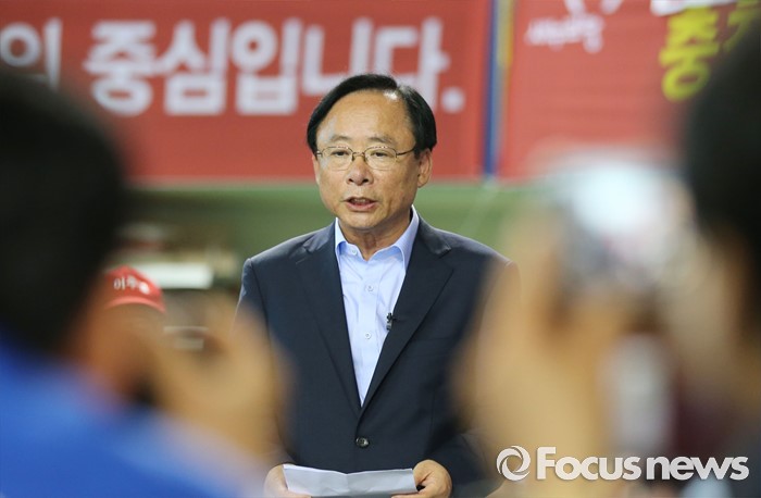 (천안=포커스뉴스) 5일 오후 충남 천안시 유관순체육관에서 열린 새누리당 대표 및 최고위원 선출 충청권 합동연설회에서 당 대표에 출마한 이주영 후보가 합동연설회를 마치고 기자회견을 하고 있다.