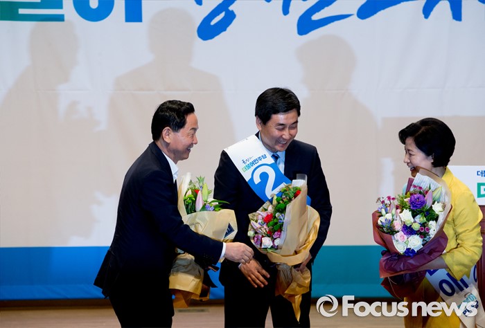 (서울=포커스뉴스) 5일 오후 서울 여의도 국회 의원회관에서 더불어민주당 당대표 선출을 위한 예비경선대회를 마친 김상곤(왼쪽부터), 이종걸, 추미애 당대표 후보가 인사하고 있다.