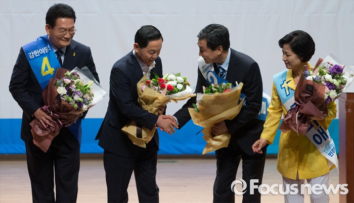 (서울=포커스뉴스) 5일 오후 서울 여의도 국회 의원회관에서 열린 더불어민주당 당대표 선출을 위한 예비경선대회에 참석한 추미애(오른쪽부터), 이종걸, 김상곤 당대표 후보가 경선 통과 후 악수하고 있다. 왼쪽 첫번째는 경선 탈락한 송영길 후보.