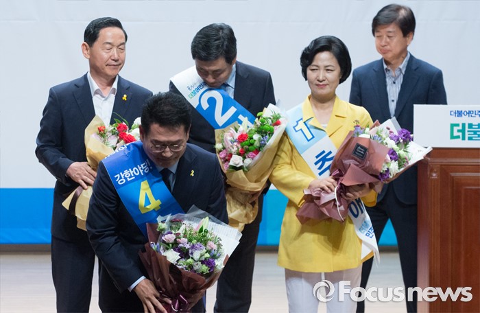 (서울=포커스뉴스) 5일 오후 서울 여의도 국회 의원회관에서 열린 더불어민주당 당대표 선출을 위한 예비경선대회에 참석한 송영길 당대표 후보가 경선 탈락 후 단상에서 내려오며 인사하고 있다. 왼쪽부터 김상곤, 송영길, 이종걸, 추미애 후보.
