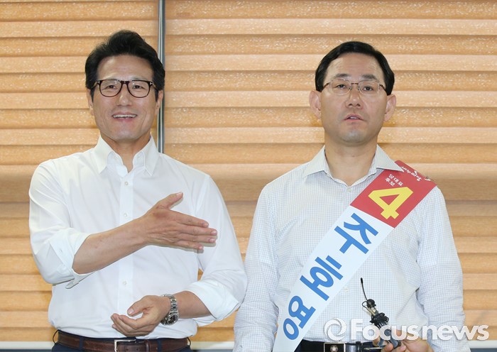 (천안=포커스뉴스) 새누리당 전당대회를 4일 앞두고 5일 오후 충남 천안 유관순체육관에서 충청권 합동연설회를 마치고 비박계 당권주자들의 2차 단일화에서 주호영 후보가 단일 후보로 결정 됐다. 정병국 후보와 주호영 후보가 주호영 후보가 단일화 됐다고 밝히고 있다.