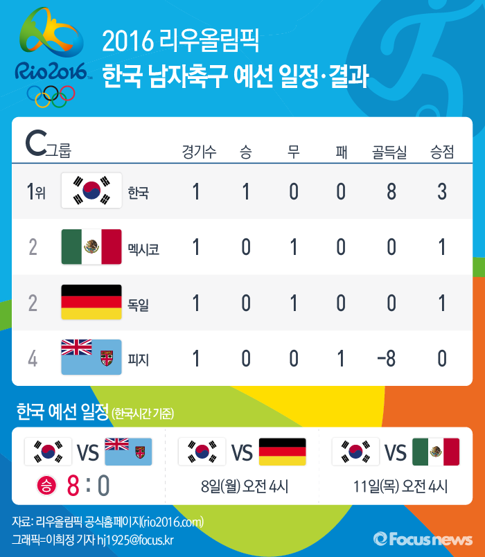 (서울=포커스뉴스) 5일 국가대표 축구팀은 2016 리우올림픽 C조 조별리그에서 피지를 8:0으로 완파했다. 한국팀의 다음 예선 경기는 독일과 8일 오전 4시(한국시간)에 치러진다.