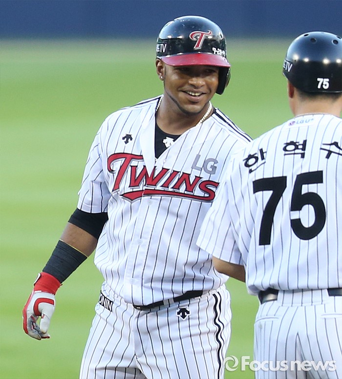 (서울=포커스뉴스) 5일 서울 잠실구장에서 열린 2016 프로야구 kt-LG 경기 1회말 무사 1,3루에서 LG 히메네스가 2타점 우중간 2루타를 치고 2루에서 한혁수 코치와 밝은 표정으로 대화하고 있다.