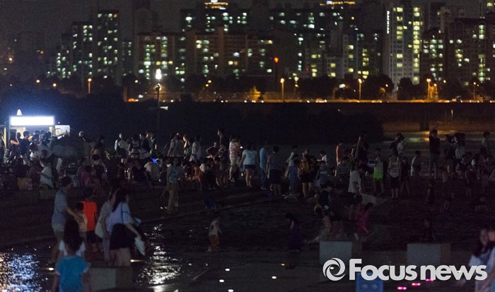 (서울=포커스뉴스) 폭염과 열대야가 지속되고 있는 5일 오후 서울 여의도 한강공원 내 물빛광장을 찾은 시민들이 물놀이를 하며 더위를 식히고 있다.