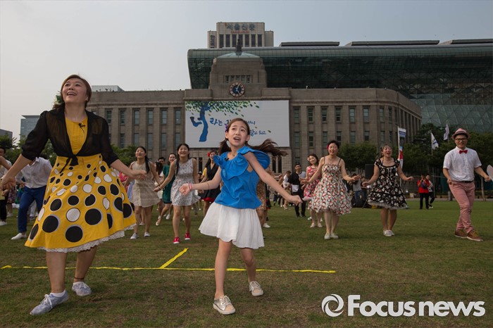 (서울=포커스뉴스) 6일 오후 서울 중구 시청 앞 광장에서 열린 '서울 스윙댄스 페스티벌'에서 청년문화예술단체 딴따라땐스홀 회원들이 음악에 맞춰 스윙댄스를 추고 있다.