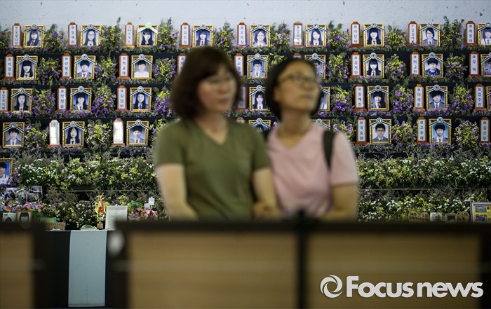 (안산=포커스뉴스) 6일 오후 경기도 안산시 세월호 참사 정부 합동 분향소에서 분향을 마친 시민들이 단원고등학교 희생자 아이들의 교실에서 옮겨진 교실 기록물들을 살펴보고 있다.