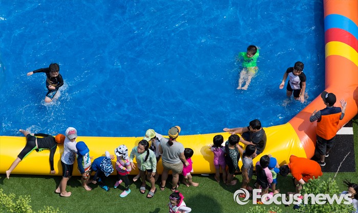 (서울=포커스뉴스) 절기상 입추인 7일 오후 서울 종로구 광화문 세종대로에 설치된 물놀이장에서 어린이들이 즐거운 시간을 보내고 있다.