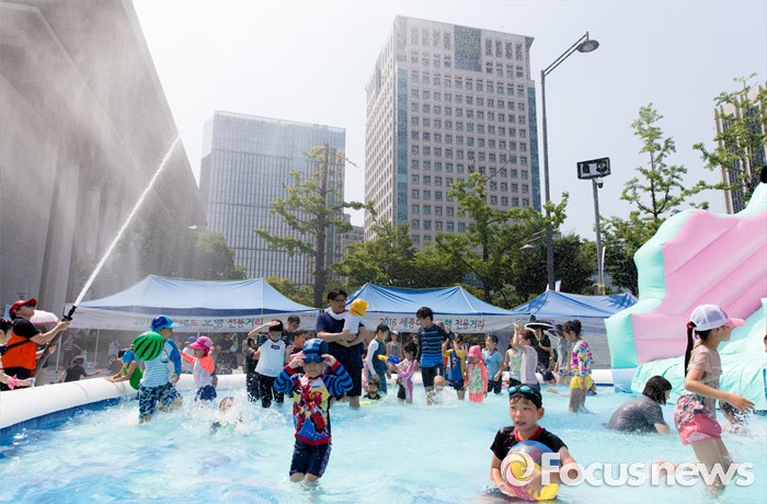 (서울=포커스뉴스) 절기상 입추인 7일 오후 서울 종로구 광화문 세종대로에 설치된 물놀이장에서 어린이들이 즐거운 시간을 보내고 있다.