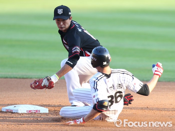 (서울=포커스뉴스) 5일 서울 잠실구장에서 열린 2016 프로야구 kt-LG 경기 2회말 2사후 LG 이형종이 좌익수 왼쪽 펜스를 맞히는 안타를 치고 2루에서 슬라이딩하고 있다. 세이프된 이형종은 합의판정에서 아웃으로 번복되었다.