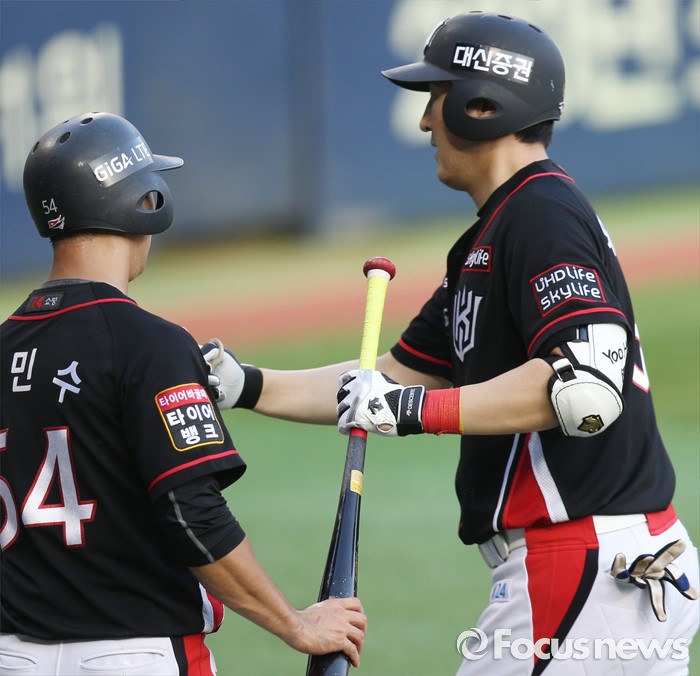 (서울=포커스뉴스) 5일 서울 잠실구장에서 열린 2016 프로야구 kt-LG 경기 3회초 2사 1루에서 kt 유한준이 좌월 2점 홈런을 치고 홈인하며 선행주자 전민수의 환영을 받고 있다.