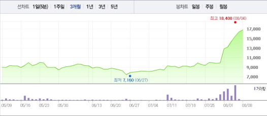 이는 1달 전 주가인 7월8일(8420원)과 비교했을 때 99.52% 상승한 수치다.