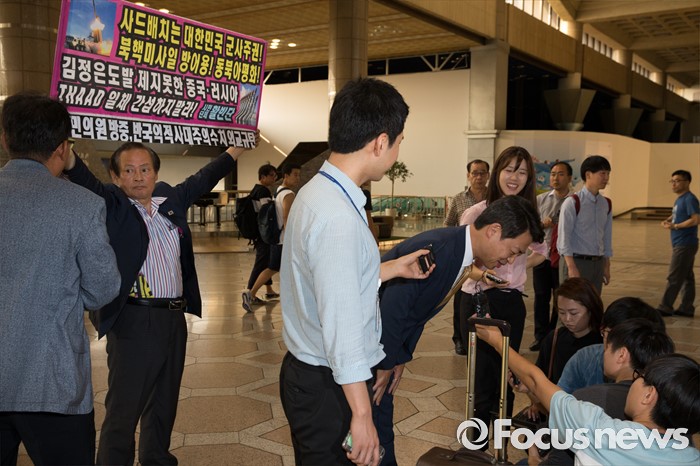 (서울=포커스뉴스) 더불어민주당 사드대책위 간사인 김영호 의원이 사드 배치와 관련한 중국 방문 일정을 위해 8일 오전 서울 강서구 김포공항에서 출국 전 취재진의 질문이 끝난 뒤 인사하는 도중 한 시민단체 회원의 피켓 항의를 받고 있다. 김 의원을 비롯해 김병욱·박정·소병훈·손혜원·신동근 의원 등 초선의원 6명은 8일부터 2박 3일간 중국에 머문 뒤 10일 귀국한다.