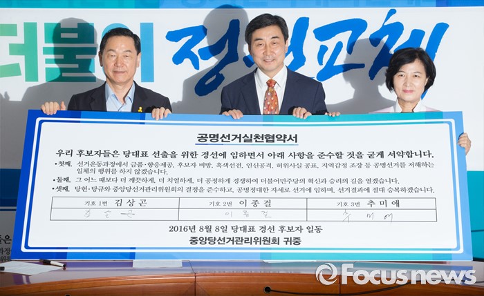 (서울=포커스뉴스) 8일 오전 서울 여의도 국회에서 열린 더불어민주당 당대표 및 부문별 최고위원 선출을 위한 공명선거 협약식에 참석한 김상곤(왼쪽부터), 이종걸, 추미애 당대표 후보가 서명 후 포즈를 취하고 있다.