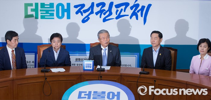 (서울=포커스뉴스) 8일 오전 서울 여의도 국회에서 열린 더불어민주당 당대표 및 부문별 최고위원 선출을 위한 공명선거 협약식에 참석한 김종인 비대위 대표가 인사말을 하고 있다. 왼쪽부터 이종걸 당대표 후보, 노웅래 선거관리위원장, 김 대표, 김상곤, 추미애 당대표 후보.