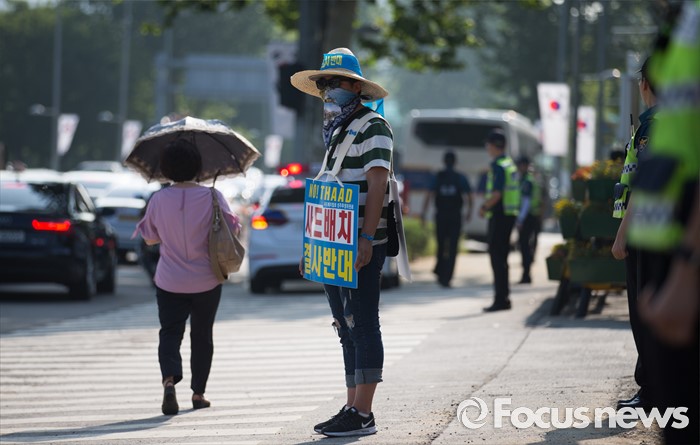 (서울=포커스뉴스) 8일 오전 서울 용산구 국방부 앞에서 사드배치철회 성주투쟁위원회 소속 성주군민이 사드 성주배치 철회를 촉구하는 피켓을 몸에 걸고 서 있다.