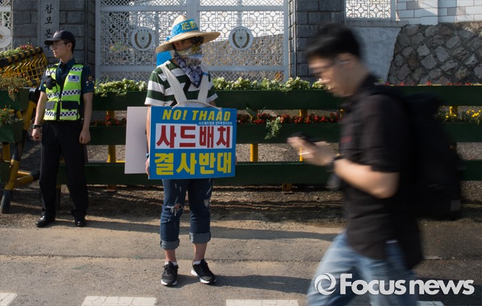 (서울=포커스뉴스) 사드 성주배치 철회 촉구 1인 시위가 이어지고 있는 8일 오전 서울 용산구 국방부 앞에 출근하는 시민이 지나가고 있다.