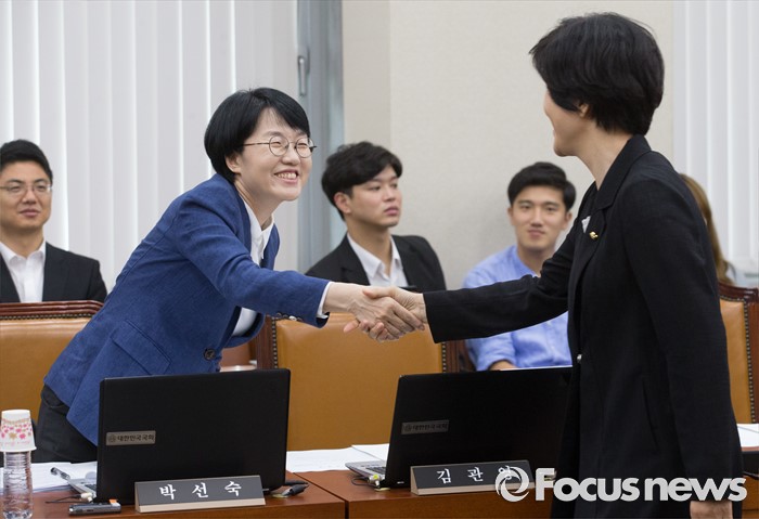 (서울=포커스뉴스) 8일 오전 서울 여의도 국회에서 열린 정무위원회 전체회의에 참석한 박선숙(왼쪽) 국민의당 의원이 김영주 더불어민주당 의원과 인사하고 있다.