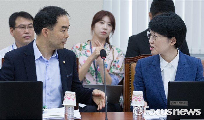 (서울=포커스뉴스) 8일 오전 서울 여의도 국회에서 열린 정무위원회 전체회의에 참석한 박선숙(오른쪽), 채이배 국민의당 의원이 대화하고 있다.