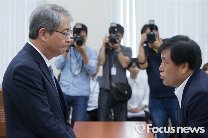 (서울=포커스뉴스) 8일 오전 서울 여의도 국회에서 열린 정무위원회 전체회의에 참석한 이진복(오른쪽) 위원장과 임종룡 금융위원장이 대화하고 있다.