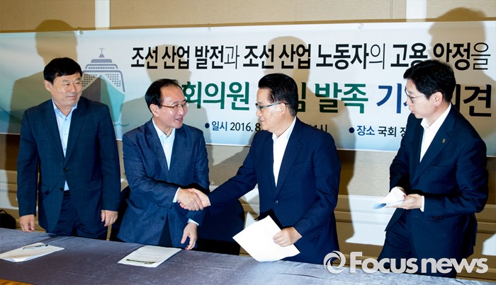 (서울=포커스뉴스) 8일 오전 서울 여의도 국회 귀빈식당에서 조선 산업 발전과 조선 산업 노동자의 고용 안정을 위한 국회의원 모임 발족 기자회견을 마친 의원들이 인사하고 있다. 왼쪽부터 김종훈 무소속 의원, 노회찬 정의당 원내대표, 박지원 국민의당 비상대책위원장, 김경수 더불어민주당 의원.