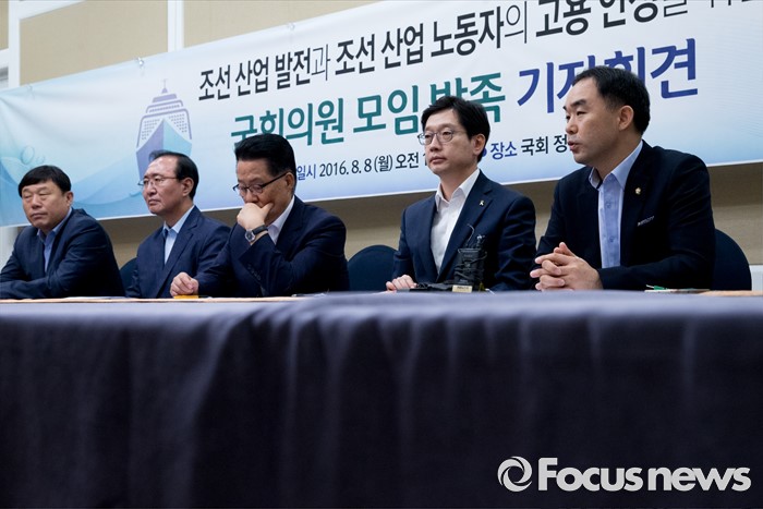 (서울=포커스뉴스) 8일 오전 서울 여의도 국회 귀빈식당에서 열린 조선 산업 발전과 조선 산업 노동자의 고용 안정을 위한 국회의원 모임 발족 기자회견에 참석한 의원들이 발언하고 있다. 왼쪽부터 김종훈 무소속 의원, 노회찬 정의당 원내대표, 박지원 국민의당 비상대책위원장, 김경수 더불어민주당 의원, 채이배 국민의당 의원.
