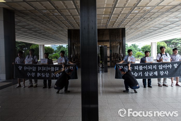 (서울=포커스뉴스) 8일 오전 서울 서초구 서울중앙지방검찰청 앞에서 가습기살균제참사전국네트워크 회원들이 SK케미칼, 애경산업, 이마트에 대한 수사를 촉구하며 3개사 전·현직 최고위 임원들에 대한 고발장을 제출하기 전 취지에 대해 설명하고 있다.