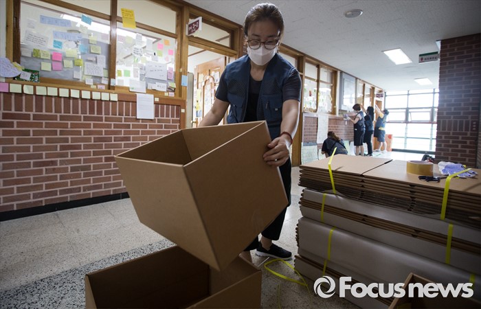 (안산=포커스뉴스) 세월호 참사에서 희생된 단원고등학교 학생들의 교실 이전 절차가 시작된 8일 오전 4.16 기억 저장소 관계자들과 자원봉사자들이 경기도 안산시 단원고등학교에서 교실 이전을 위한 준비 작업으로 '종이 유물 정리'를 하고 있다.