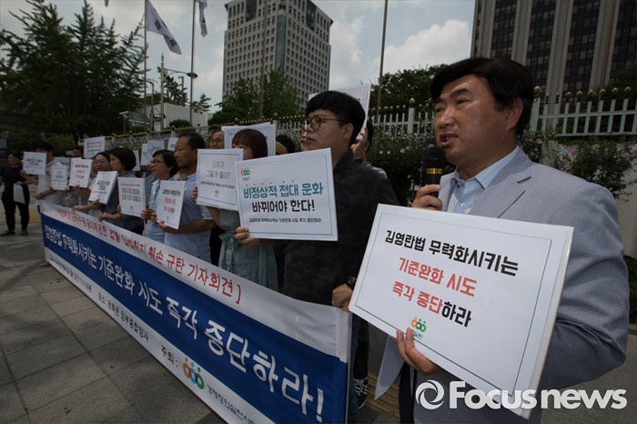 (서울=포커스뉴스) 고계현 경실련 사무총장이 8일 오전 서울 종로구 정부서울청사 정문 앞에서 열린 김영란법 무력화시키는 기준완화 시도 중단 촉구 기자회견에서 발언하고 있다.