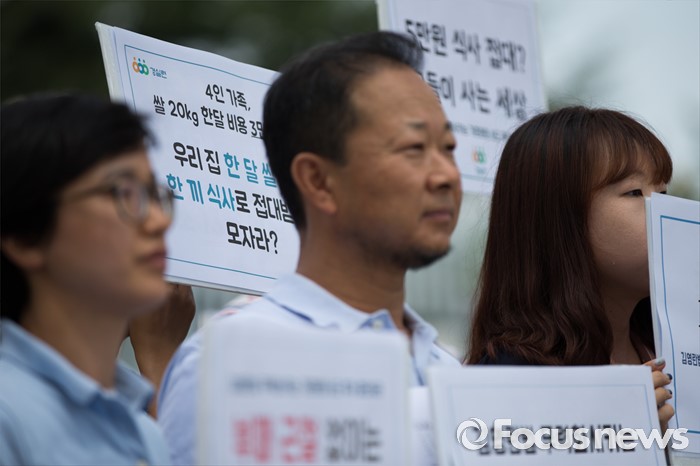(서울=포커스뉴스) 8일 오전 서울 종로구 정부서울청사 정문 앞에서 열린 김영란법 무력화시키는 기준완화 시도 중단 촉구 기자회견에서 경제정의실천시민연합(경실련) 회원들이 피켓을 들고 있다.