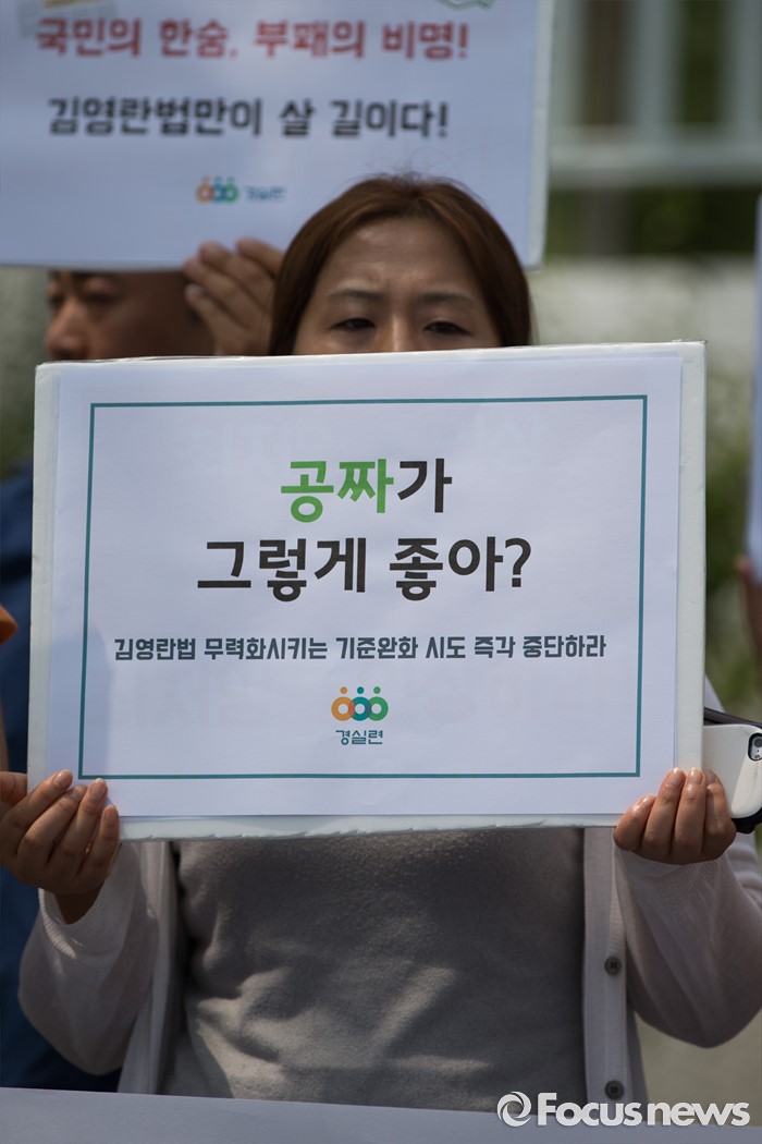 (서울=포커스뉴스) 8일 오전 서울 종로구 정부서울청사 정문 앞에서 열린 김영란법 무력화시키는 기준완화 시도 중단 촉구 기자회견에서 경제정의실천시민연합(경실련) 회원들이 피켓을 들고 있다.