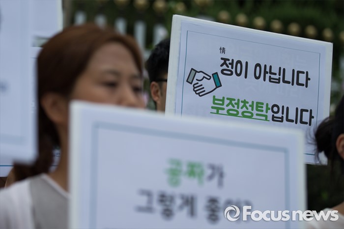 (서울=포커스뉴스) 8일 오전 서울 종로구 정부서울청사 정문 앞에서 열린 김영란법 무력화시키는 기준완화 시도 중단 촉구 기자회견에서 경제정의실천시민연합(경실련) 회원들이 피켓을 들고 있다.