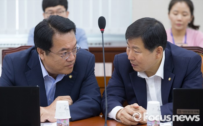 (서울=포커스뉴스) 8일 오후 서울 여의도 국회에서 열린 국방위원회 전체회의에 참석한 정진석(왼쪽) 새누리당 원내대표와 이철규 의원이 대화하고 있다.