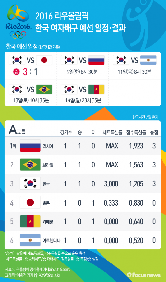 | △ [그래픽] 2016 리우올림픽 한국 여자배구 예선 일정·결과 |