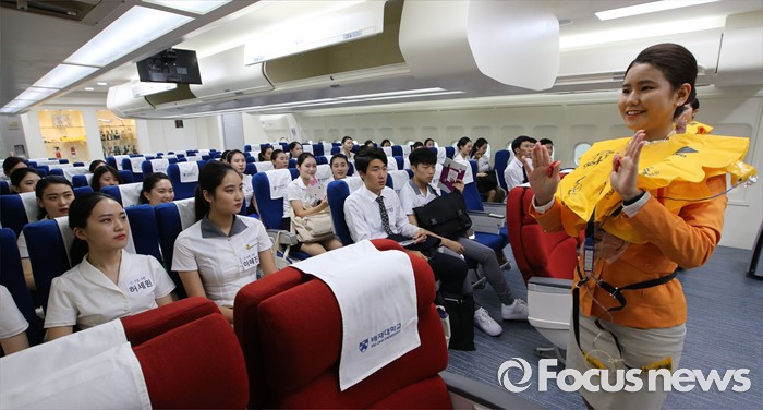 (대전=포커스뉴스) 8일 오후 대전 배재대학교에서 열린 제3회 예비승무원대회 예선에 참가한 고등학생들이 기내 안전 교육을 받고 있다.