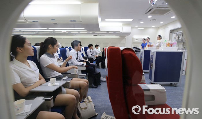 (대전=포커스뉴스) 8일 오후 대전 배재대학교에서 열린 제3회 예비승무원대회 예선에 참가한 고등학생들이 기내 서비스를 체험하고 있다.