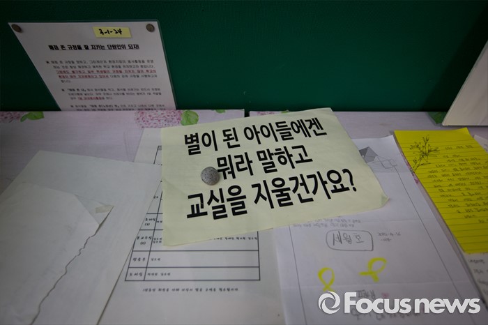 (안산=포커스뉴스) 세월호 참사에서 희생된 단원고등학교 학생들의 교실 이전 절차가 시작된 8일 오후 경기도 안산시 단원고등학교 교실에 추모객들이 남긴 메시지들이 보이고 있다.