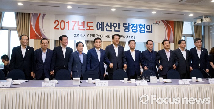 (서울=포커스뉴스) 9일 오전 서울 여의도 국회 귀빈식당에서 열린 2017년도 예산 당정협의에 참석한 정진석 새누리당 원내대표, 김광림 정책위의장과 유일호 경제부총리 겸 기획재정부 장관 등 참석자들이 취재진을 향해 포즈를 취하고 있다.