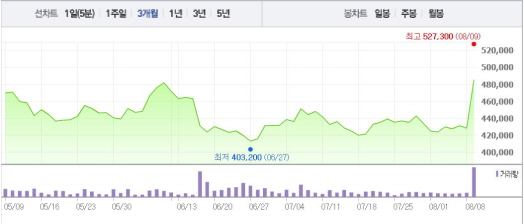 매수상위 창구로는 모건스탠리, 키움증권, 하나금융투자, C.L.S.A증권 등이 올라와있다. 외국인의 매수가 주가를 끌어올리는 것으로 보인다.주가흐름<사진출처=네이버 캡쳐>