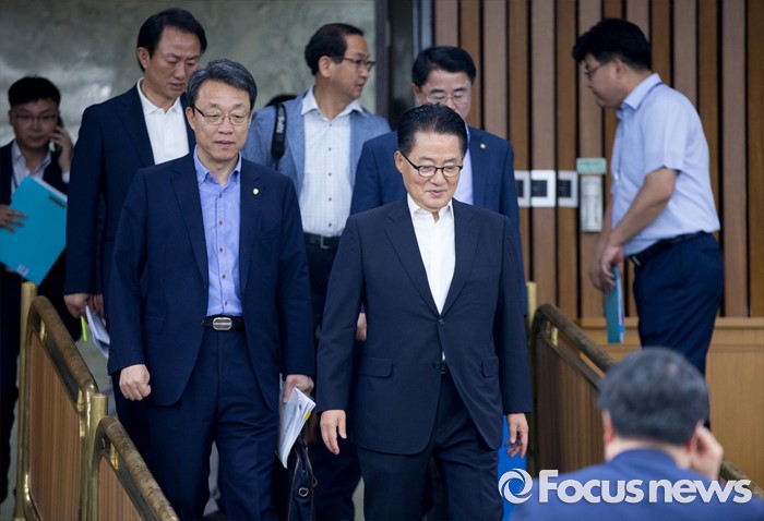 (서울=포커스뉴스) 9일 오전 서울 여의도 국회에서 열린 국민의당 의원총회에 박지원(오른쪽) 비상대책위원장과 김성식 정책위의장 등이 참석하고 있다.
