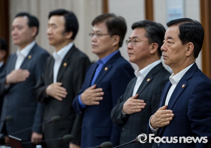(서울=포커스뉴스) 9일 오전 정부서울청사에서 열린 국무회의에 참석한국무위원들이 국민의례를 하고 있다.