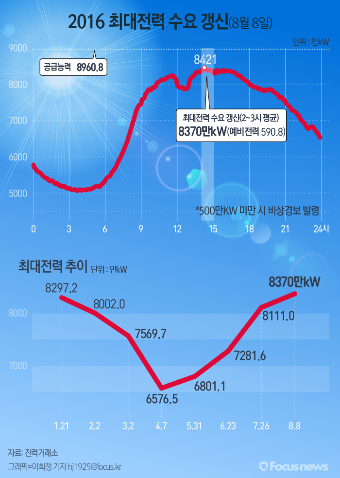 (서울=포커스뉴스) 8일 전력거래소에 따르면 오후 2~3시 전력수요가 8370만㎾까지 올라 사상최고 기록을 갱신했다고 밝혔다. 예비력은 591만㎾, 예비율은 7.0%를 기록했다.