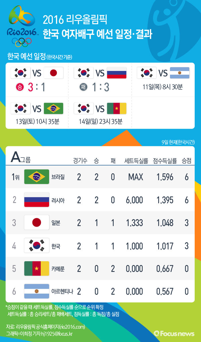 | △ [그래픽] 2016 리우올림픽 한국 여자배구 예선 일정·결과 |